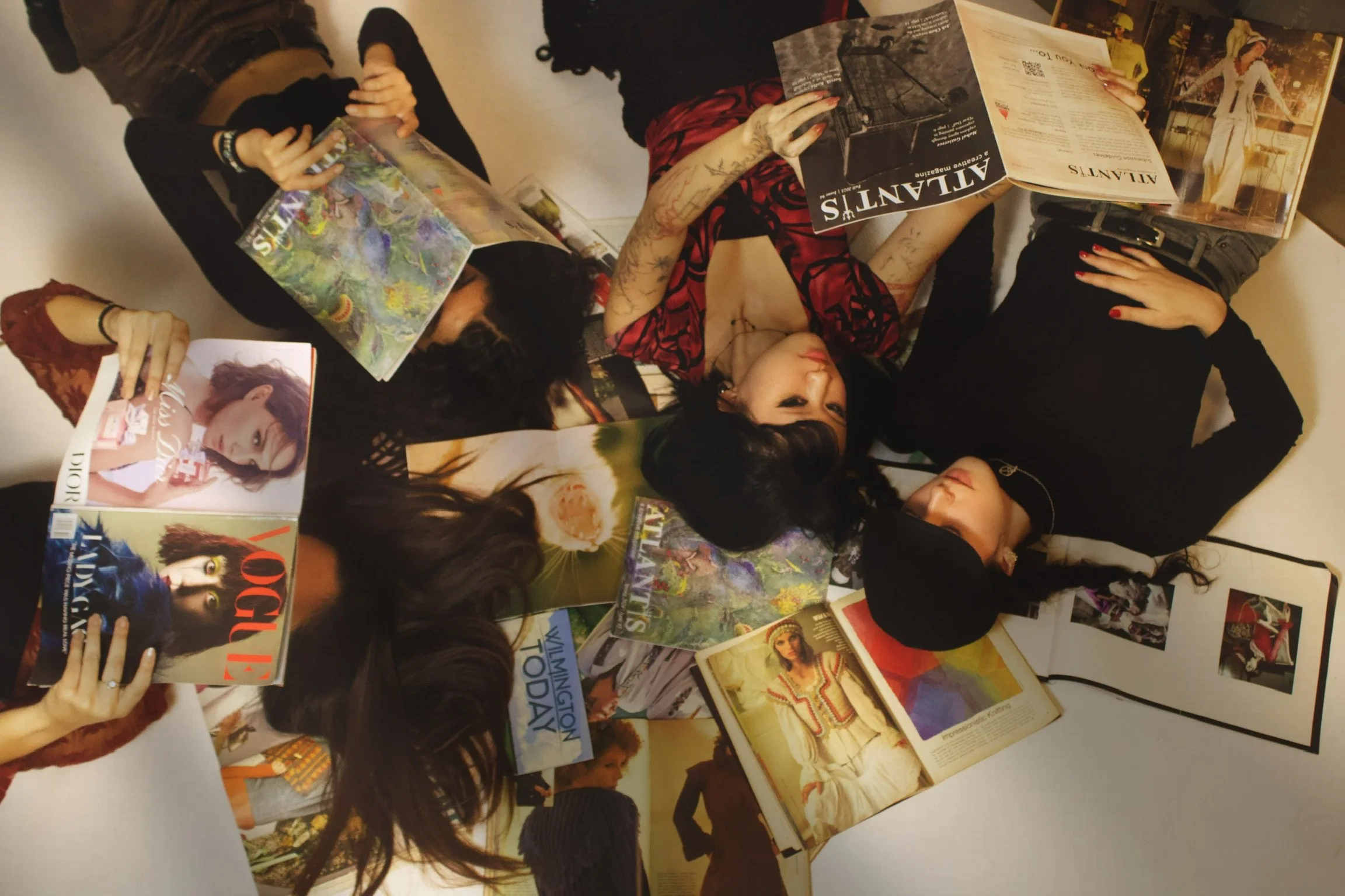 Four women lying on a white floor surrounded by magazines, reading and looking at fashion and lifestyle magazines, some open and some stacked.