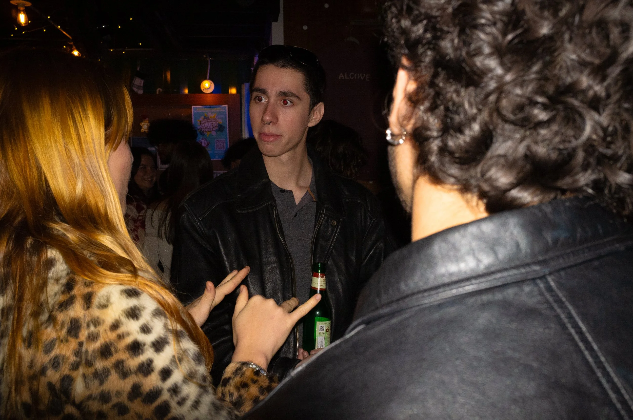 Three people engaged in a conversation at a dimly lit bar or club, with a background of more patrons and illuminated signs.